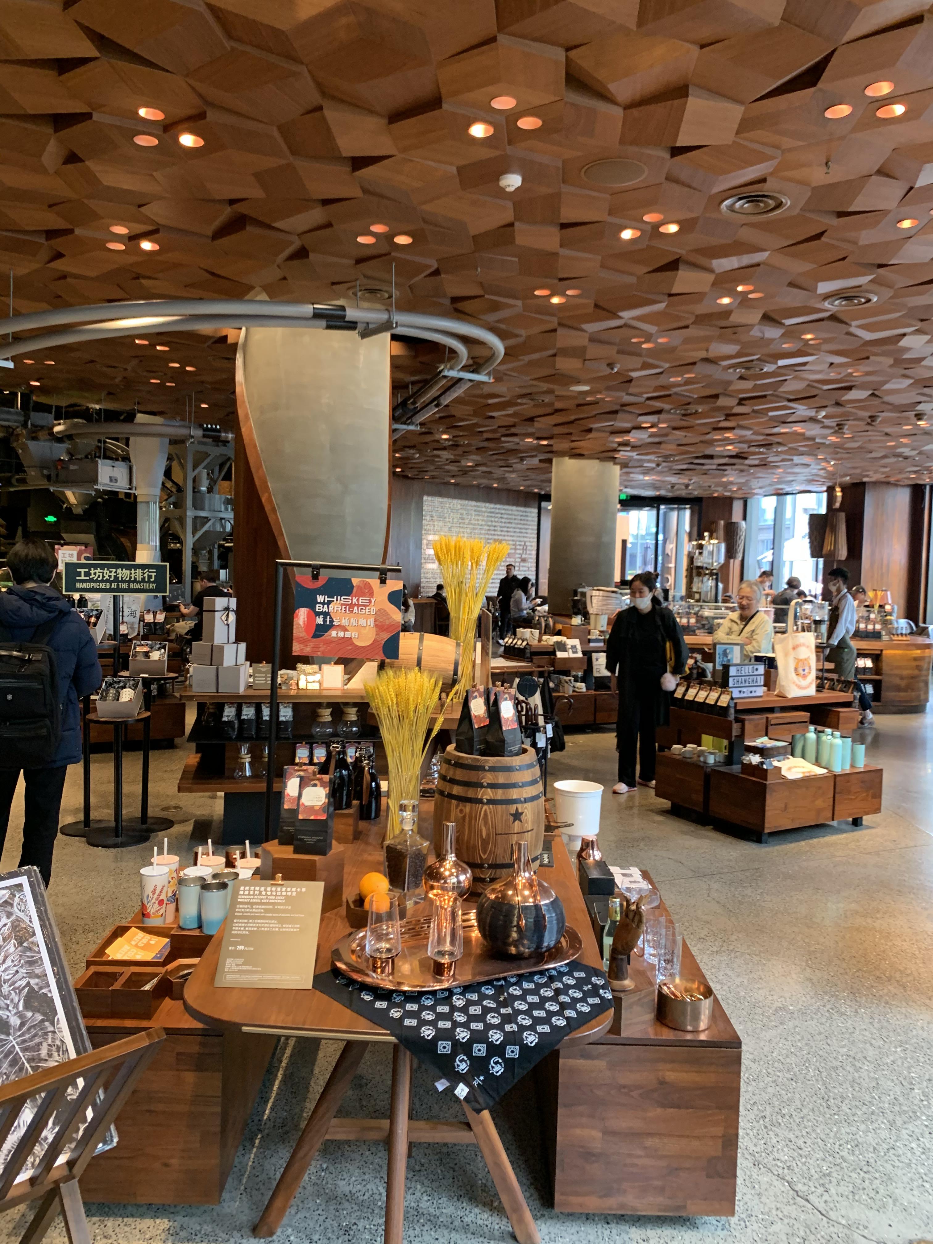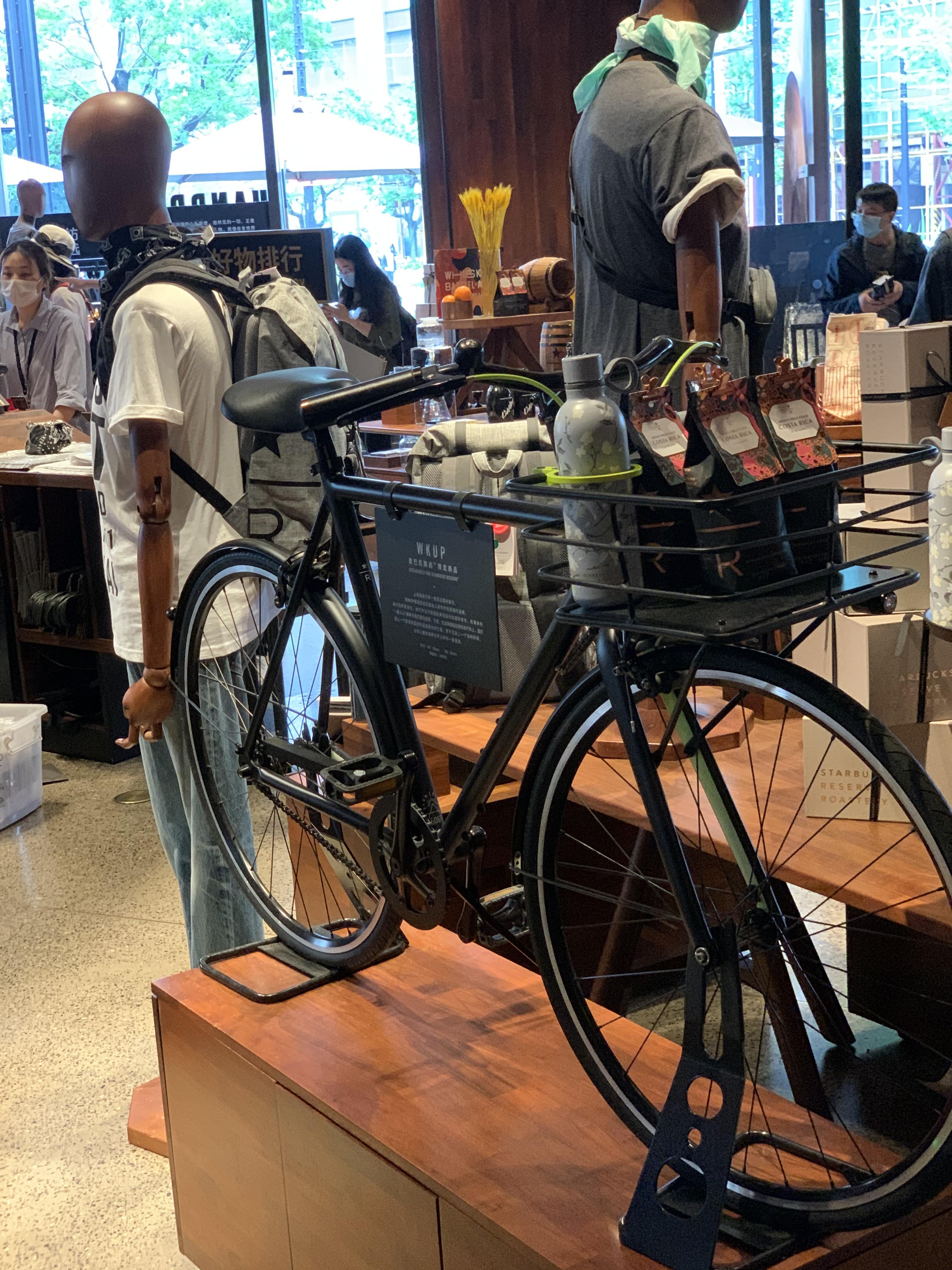 외부 건물규모도 그렇지만 내부에 들어가면 여기가 카페인지 종합 쇼핑몰인지 헷갈릴 정도였다. 로스팅하는 거대한 기계와 그 주변을 둘러싼 온갖 굳즈들...스타벅스 자전거도 팔다니...저게 처음엔 디스플레인줄 알았는데 판매품이었다. 2층은 커피가 아닌 차 전용 공간인데, 스벅이 중국에서 커피 말고도 차 문화 보급에도 노력하는것 같았다.